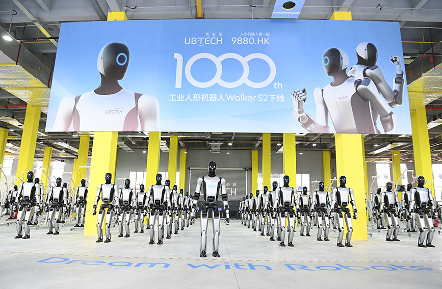柳州优必选第1000台工业人形机械人Walker S2下线典礼现场。超百台机械人使用于废钢定级、聪慧配煤精辟优化等场景。